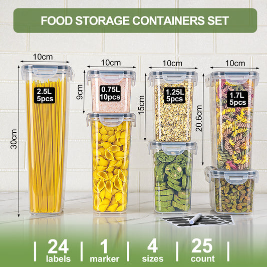 L LONGANCHANG Airtight storage containers with lids, set of 25: Kitchen storage boxes for flour, cereal, sugar, spaghetti, pasta | Storage container set 2.8l/2.0l/1.4l/0.8l | BPA-free | Dishwasher safe