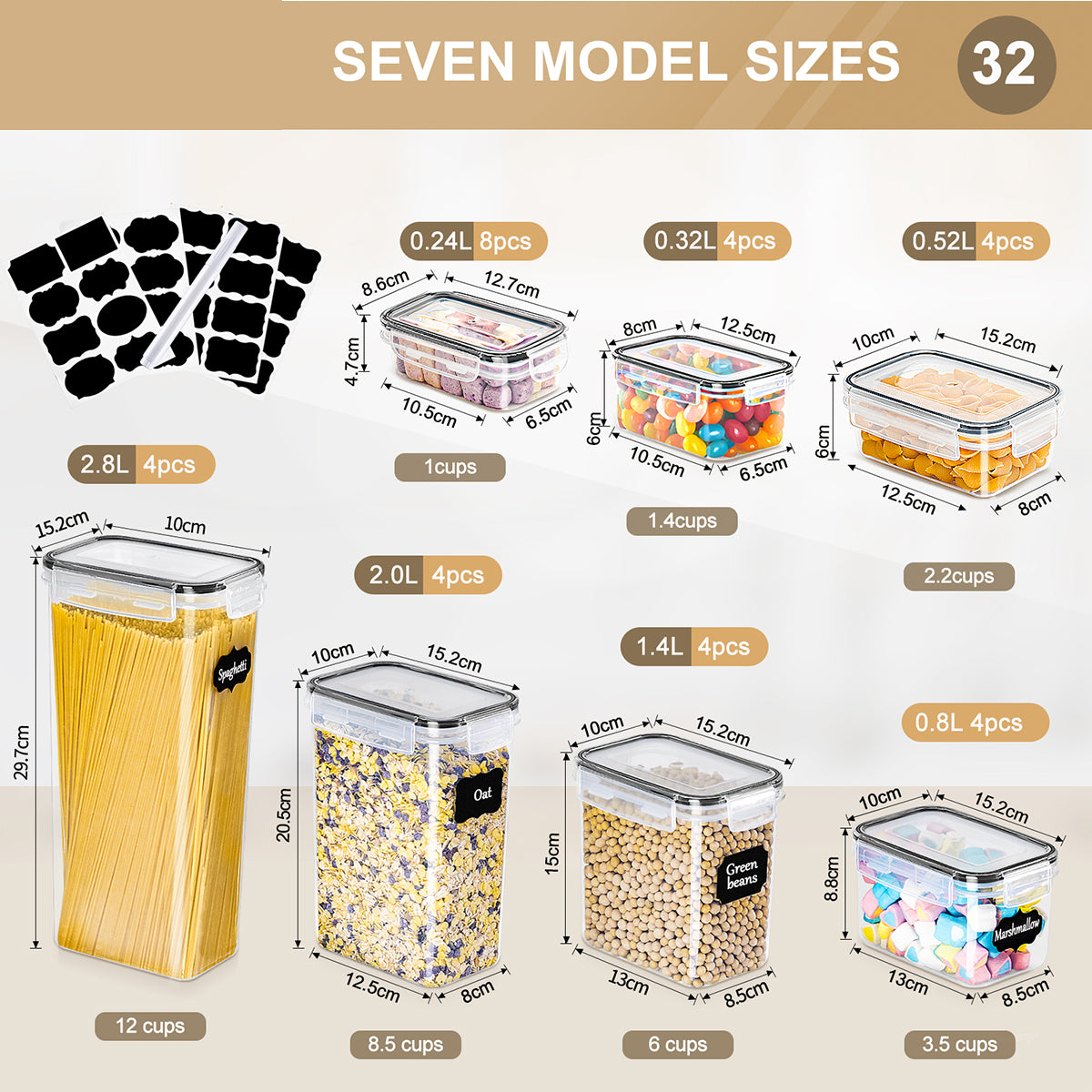 Includes 2800 ml ×4, 2000 ml ×4, 1400 ml ×4, 800 ml ×4, 520 ml ×4, 320 ml ×4, 240 ml ×8. Total capacity: 32.28 L – ideal for all kitchen storage needs.